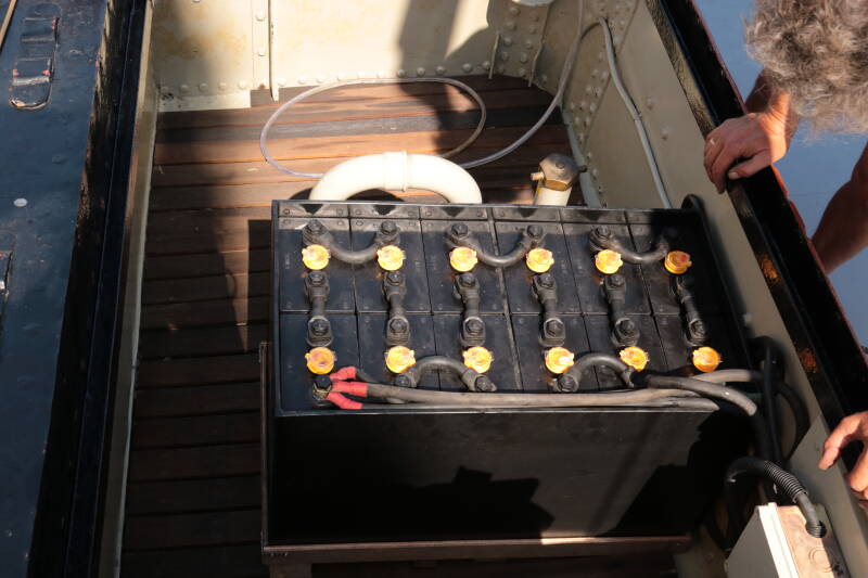 De afgelopen week was het net tetrissen. De afspraken pasten keurig achter elkaar in de agenda, maar toen kwam daar woensdag het accuprobleem tussen. Frans kwam me vertellen dat de accu’s kookten en borrelden. Er komen dan ook giftige stoffen vrij, maar ons geluk is dat de accu’s buiten in het herft (opbergplaats vóór onder de luiken) staan. In de auto dan maar en naar de accuboer in Werkendam. Hij heeft nieuwe tractie-accu’s droog staan. Deze moeten dus gevuld worden en dan opgeladen. Met een beetje geluk kan ik ze u vrijdagmorgen leveren. Top! Donderdag allerlei voorbereidingen getroffen (zoals een noodkabel naar de meterkast aan de wal) en vrijdagmorgen vroeg de stroom eraf en de oude accu’s aan de wal sjouwen. Ik krijg die dingen niet versjouwt en Frans heeft een flinke krachttraining achter de rug, haha. O ja door elektra-tekort moesten we uit eten, wat erg, ik heb me wel opgeofferd hoor. Maar ja vrijdagmorgen kwam dus keurig op tijd het busje met de nieuwe accu’s voorrijden. Twaalf uitladen en twaalf oude inladen, pff. Alles koppelen en aansluiten en jawel het leed is geleden alles werkt perfect. Toch goed dat het geregeld is voor we aan de reis beginnen.