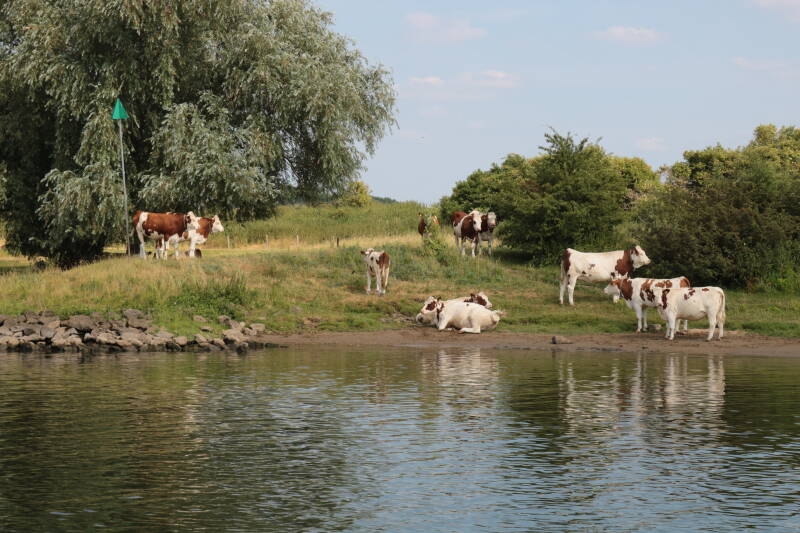 Gisteren dus vertrokken en we hebben de keus gemaakt om via de Maas naar Nijmegen te varen, daar Weurt buiten schutten en dan de Rijn op. Na de lunch zijn we weggegaan en de Afgedamde Maas op gevaren richting Heusden. Op de Maas konden we genieten van een mooie rustige rivier met van die Paulus Potterplaatjes, koeien onder de bomen en in het water. Echt Hollands landschap. We zijn gestopt in een zandwin-gat bij Gewande. Een rustig plekje en dicht bij onze Kirsten, maar op ongeveer 8 km afstand. Leuk vond Kirsten, dan kom ik. Wij de kano in het water en naar de wal om te kijken waar ze aan boord kan stappen. Jammer dan overal hekken en verboden. Kirsten maar weer afgebeld. Wel een prachtige zonsondergang gehad en een lucht vol luchtballonnen.