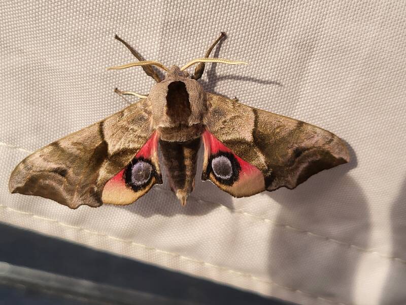 Het is weer knap warm en daarom besluiten we nog fijn een dag op dit mooie meer te blijven liggen. Ook zagen we een bijzondere nachtvlinder. Deze lijkt op eikenschors en toen Frans ertegen tikte, omdat hij weg moest om het zonnescherm op te ruimen veranderde dit beestje. Hij kreeg een rode vlek met oogjes erop. Dit is om af te schrikken. Hij heet Pauwoogpijlstaart.