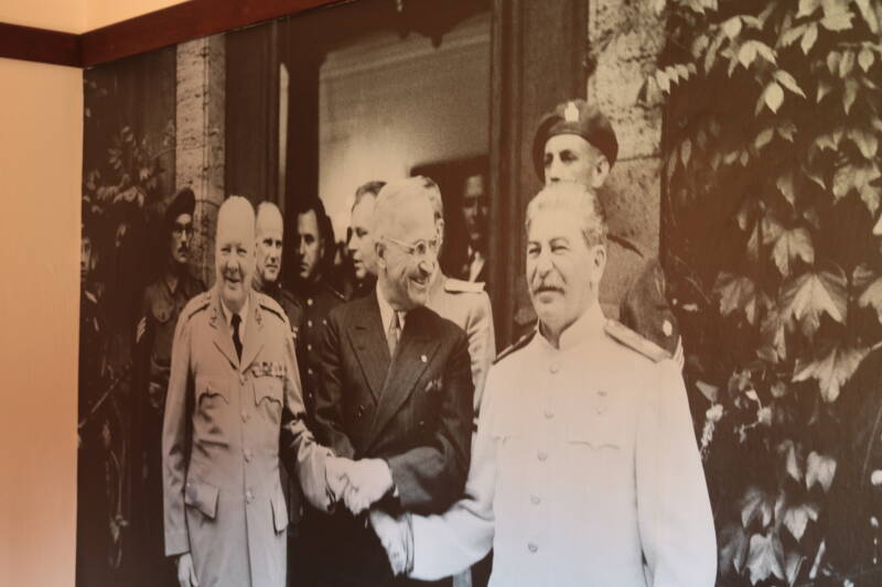 Vandaag zijn we naar de noordkant van Potsdam, een voorstad van Berlijn gevaren en nu zijn we de geschiedenis ingedoken. Kort voor onze kop staat een oud gebouwtje dat vroeger gebruikt werd als douanehuisje. Hier lag dwars over het kanaal een barricade waar schepen eerst gecontroleerd werden voor ze de grens naar West Berlijn over mochten. De officiële grens ligt nog een kilometer verderop. Vast en zeker om de ruimte te hebben om schepen die ertussendoor sneaken alsnog tegen te houden. We lopen door een park met paleizen en kasten van huizen. Op Schloss Cecilienhof is na de Tweede Wereldoorlog het akkoord van Potsdam gesloten tussen de Russen, Amerikanen en Britten. We konden de conferentiezaal en de werkkamers van de hoge heren Churchill, Truman, en Stalin bewonderen.