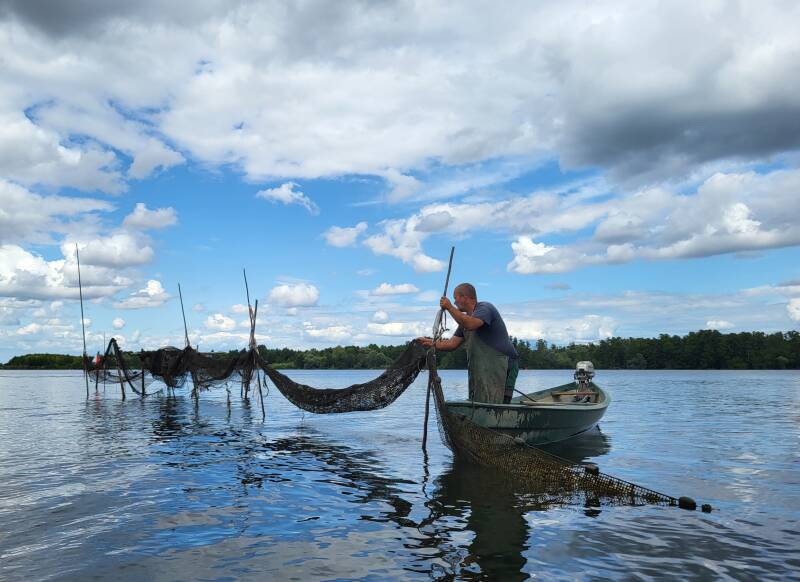 Het wordt misschien wat saai, maar we blijven wederom op een meer bij Havel kilometer 42,5. Dit keer gaat de kano het water in en maken we een tochtje en komen langs een visser die bezig is met zijn netten. Frans vertelt dat hij van het Visserijmuseum is en vraagt of hij een foto mag maken.
