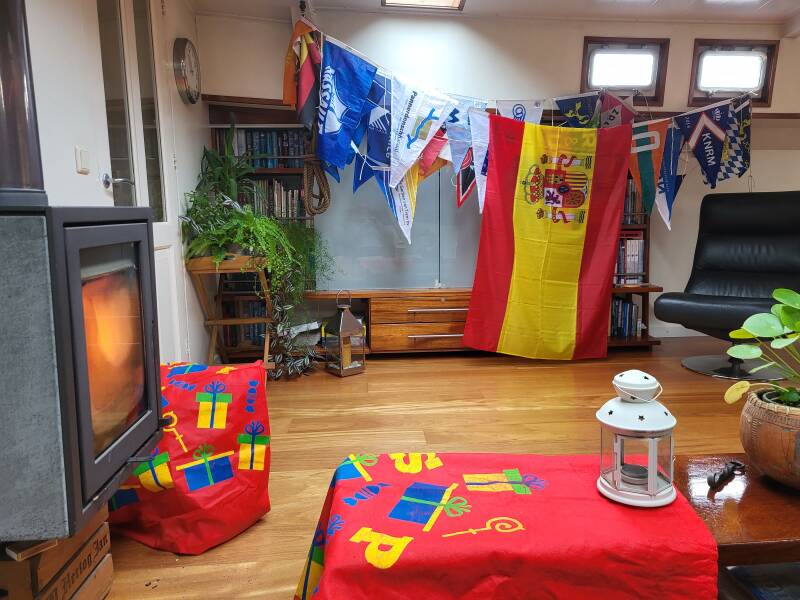 De afgelopen week stond in het teken van de hoogwater-App en de buienradar. Het water stijgt snel en het zal er om hangen of we de Sint met de Talisman naar de Historische haven kunnen varen. Op onze eigen plek is het steiger ondergelopen en de overgang van het passantensteiger naar de wal staat ook vol water. Er is veel App contact met Sinterklaas en gelukkig kan het zaterdag doorgaan. Er worden rijplaten gelegd, zodat de Goede man met droge voeten naar de wal kan komen en de parkeerplaats waar het Pietenfeest gepland staat is om 16.00 uur droog nadat het ervoor blank heeft gestaan.