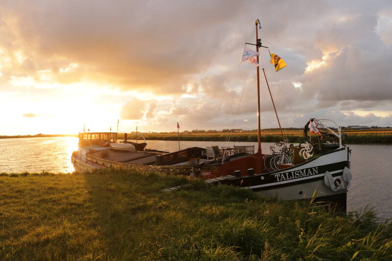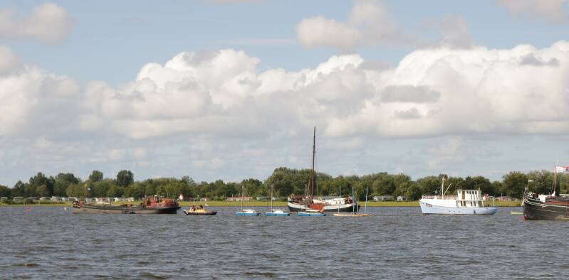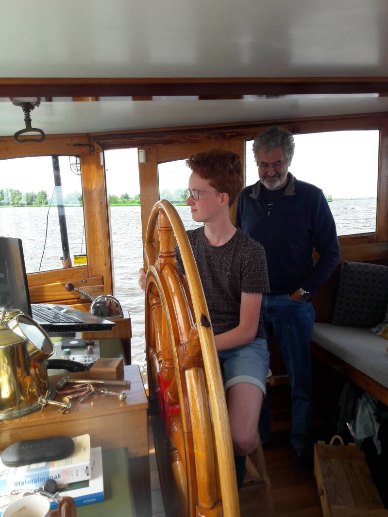 Maandag is Frans met het jolletje op pad gegaan om nicht Christa met Florian en Hannelore op te halen. Met hen zijn we naar Zoutkamp gevaren. We laten Friesland achter ons en varen Groningen binnen. Het is prachtig varen; lekker groen, plat en veel bochten in de rivier. Typisch Nederland dus. Florian mag ook even sturen en dat doet hij heel goed. In Zoutkamp komt Jeroen zijn gezin weer ophalen, wij halen wat boodschappen en varen verder.