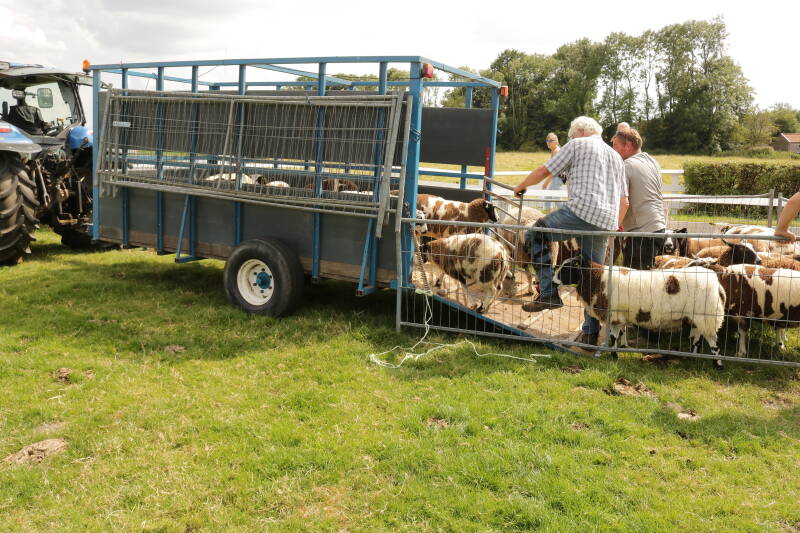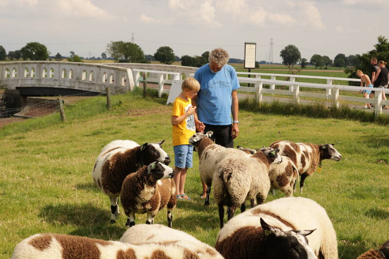 Als we een verslag maken van onze reis dan moeten we heel eerlijk zijn en ook wat stommiteiten vermelden. Met het rood op de kaken moet ik vertellen dat ik uit de kano ben gevallen. Nee niet lachen dit is HELEMAAL NIET LEUK. Wat ik deed weet ik eigenlijk niet, maar het ging mis met het evenwicht en plons. Snel mijn telefoon uit mijn zak gelegd en naar de kont van ons schip gezwommen om daar via de treden op het roer uit het water te klimmen. Jelte verdient trouwens een pluim, want hij kwam gelijk met een reddingsboei aan. Hij is echt de zoon van een KNRM man. Eenmaal aan boord kwam ik erachter dat mijn bril weg was. Dit is pas echt balen, want eigenlijk leg ik mijn bril als we gaan kanoën altijd af, behalve vandaag dus en het is ook nog een dure bril. Frans probeert met een sterke magneet om mijn bril boven te halen, maar waarschijnlijk is hij niet van staal o.i.d. Volgende manier met het schepnet waar hij vorige week twee visjes mee heeft gevangen. Ook dit gaat niet, maar Frans geeft niet snel op en bind het schepnet aan een lange pikhaak en schraapt ermee over de bodem. Net als ik het heb opgegeven en koffie ben wezen halen kom ik boven en zie mijn bril in het schepnet zitten. Een gouden medaille voor Frans op het onderdeel brilvissen. Jammer genoeg loopt het met mijn telefoon minder goed af. Het gevolg is dat ik volledig van Frans afhankelijk ben op mobiel gebied. Ik kan dus geen telefoontjes of Appjes meer ontvangen. Na een uur kan het kanotochtje dan toch doorgaan. Het is trouwens een enerverende dag , deze dag. Als we op ons terras aan een kopje thee met jawel Lariekoek zitten (in Ezinge verkopen ze Lariekoek, haha echt iets voor Jelte om op te trakteren) klinkt er wel erg veel geblaat door de schapen aan ons wallenkantje. Hup de wal op en gaan kijken. De boer is er met de trekker en aanhanger. De lammeren zijn groot genoeg om van de mamaschapen gescheiden te worden. Een heel gedoe dus. Nou zou ik persoonlijk ook flink tekeer gaan als mijn kinderen afgevoerd zouden worden en ik leefde dus met de beestjes mee. Frans en Jelte als geboren schapenkopjes staan prima tussen de wolbalen in.