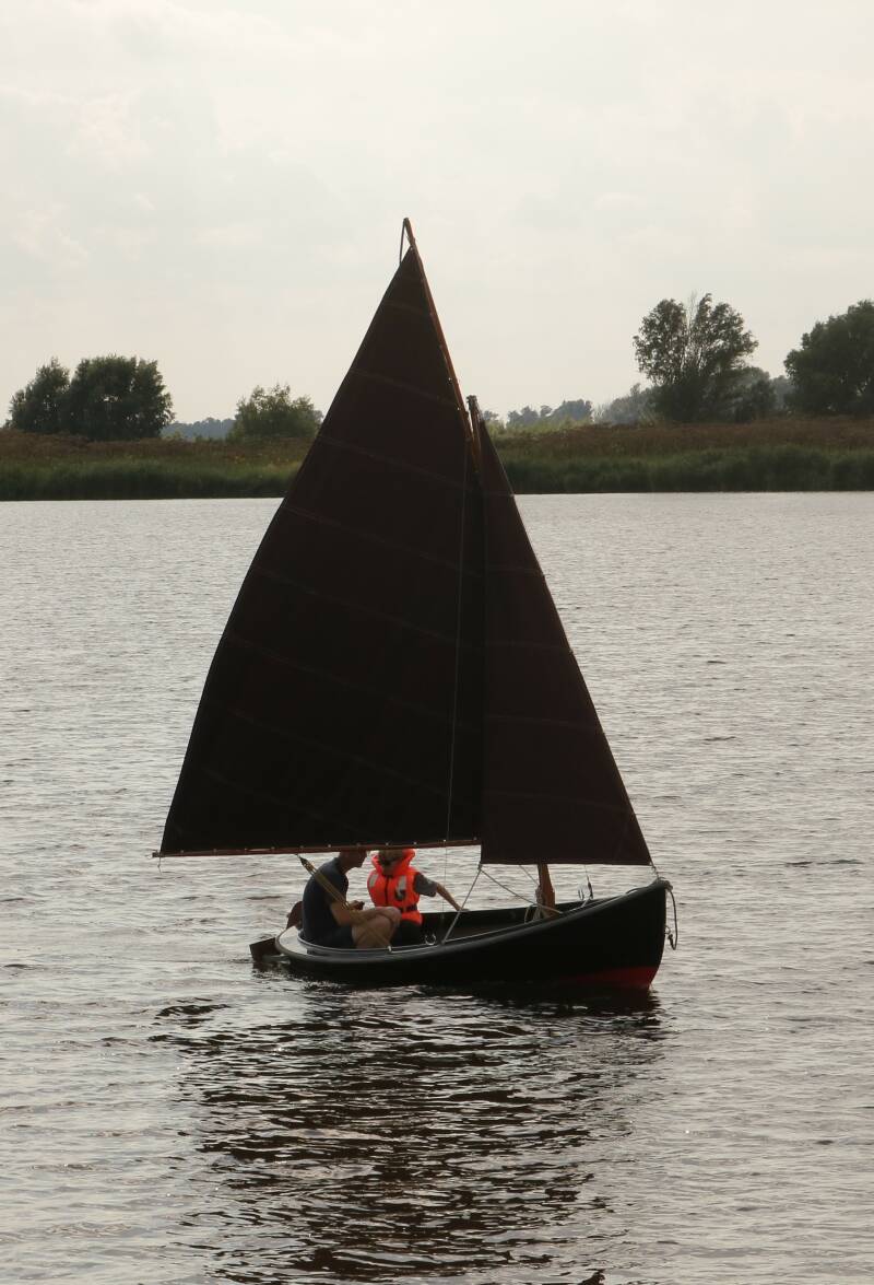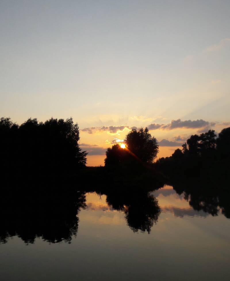 Als we willen vertrekken moeten we door een brug met zelfbediening. Helaas zit de kast waarin de bediening zit met een hangslot op slot. We hebben wel een sleutel voor de bediening, maar die sleutel past niet en bellen dan toch maar om een brugwachter. Zelfbediening … dus niet. De brug moet met de hand worden opengedraaid en de man laat de klep behoorlijk schuin staan, zodat het flink manoeuvreren is voor ons schippertje. Hierna volgt een lage brug met een eronder hangende lamp. Zodat ook deze met precisie moeten worden gepasseerd. En dan na 500 meter varen zie ik me toch een mooi steigertje aan een fraaie plas. Prachtig om te zeilen en te zwemmen. Als ik Frans er op wijs zitten de kinderen al direct te gillen: ja zeilen, ja zwemmen. Je snapt het al de paaltjes gaan het water in en ook het jolletje wordt opgetuigd. Sjoerd is er de hele middag niet uit te krijgen, haha. Hij zeilt met wisselende bemanning over de plas en ik ga nog zwemmen met Jelte en Tess. Een prachtige stille avond met gezellige muggetjes en er is alweer een dag voorbij.