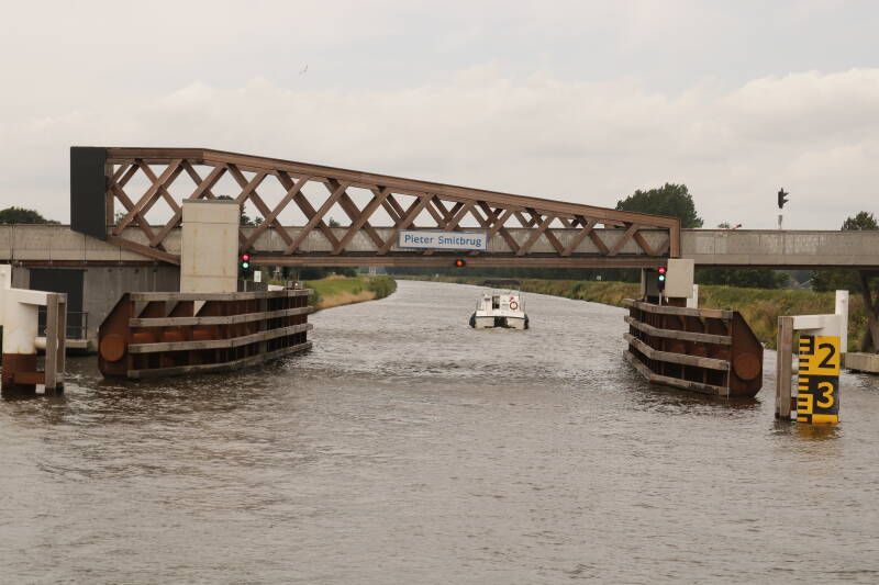 We kabbelen op het gemakje door de provincie Groningen. Een mooie belevenis voor onze logees, want ze moeten zelf een brug en een sluis bedienen. Vooral de brug vinden ze heel gaaf, omdat ze het verkeer mogen stoppen om de brug te openen. In Winschoten zijn we heel vriendelijk ontvangen en tijdens een rondleiding op de kinderboerderij/ zorgboerderij aan Sjoerd en zijn gezin vertelde de vrouw dat Winschoten sinds februari dit jaar de langste fiets-, en voetgangersbrug van Europa heeft. De Pieter Smitbrug is 800 meter lang en laten wij die nu juist passeren. De brug gaat over het Winschoterdiep, de A7 en over water naar de Blauwe stad.