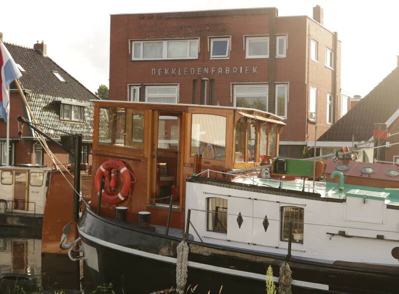 Net voor ik dit stukje ga schrijven komt er een mail binnen van de fotograaf Simon Marrink die bij ons op het Lauwersmeer was. Hij blijkt hier te wonen en stuurt ons een foto van vanavond en vertelt dat we voor de voormalige machinefabriek van Gorter liggen. Deze bouwde Deutz-motoren in schepen en ook de allereerste motor een Deutz van 55pk in ons schip, toen de Oetciena geheten. We liggen dus duidelijk op historisch water.