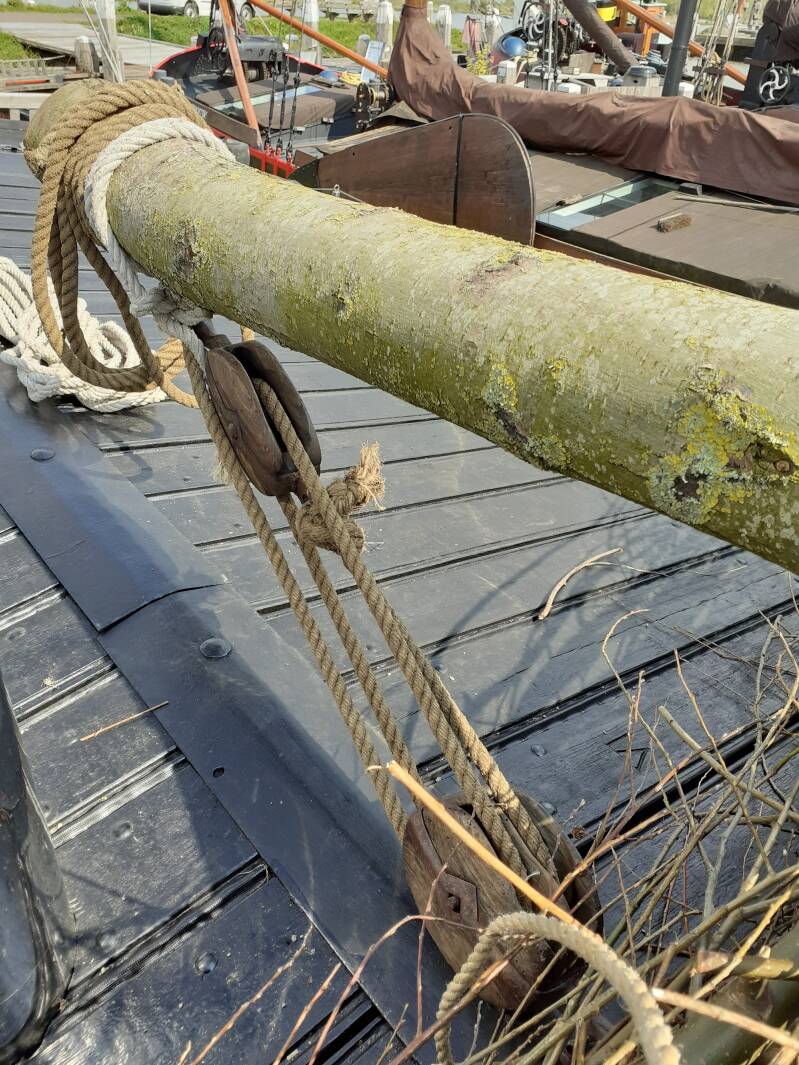 De lading hebben we gesjord door de grote tak erover te leggen en deze aan een kant vast te binden en aan de andere kant hebben we deze met een antieke takel vastgesjord. Deze takel hebben we gekocht van iemand wiens opa in de Biesbosch werkte en zijn lading rijshout hiermee aansjorde.