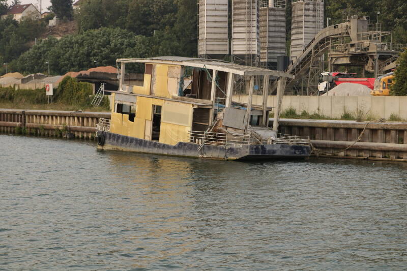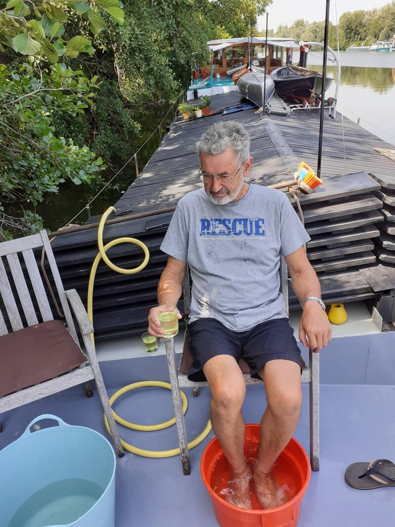 L`Oise is een mooie rivier. Groen en soms waan je jezelf in de jungle. Het voordeel van het groen is dat je er in kan schuilen voor de zon. Ze geven wel 42gr. op, maar op het water is het altijd iets koeler en bij groen ook. We zoeken naar plekjes waar we zo lang mogelijk in de schaduw liggen. Varen doen we in de ochtend en begin van de middag zoeken we dan een plek. De zonnetent wordt opgezet en de teilen gevuld met water een boekje en een glaasje drinken en vooral niet inspannen. Na het avondeten lekker in de weer met de dekwasslang en dan is het leven zo gek nog niet.