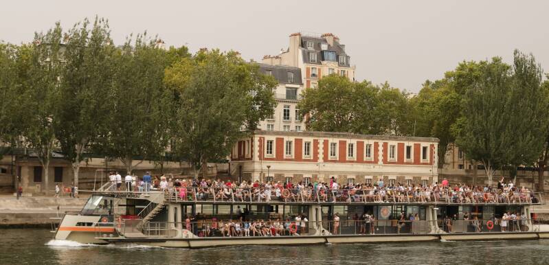 We kronkelen samen met de Seine naar en door Parijs. De Seine heeft heel grote lussen en zo kan het zijn dat we maar een paar kilometer hemelsbreed van de Eiffeltoren verwijderd zijn, maar dat het nog een paar uur duurt tot we daar daadwerkelijk langsvaren. We hebben geen duidelijk plan voor Parijs. We hebben gehoord dat je niet meer zo gemakkelijk ergens kan liggen. Als we een plekje zien dat ons wat lijkt maken we vast en als ik op google maps kijk zie ik dat het twee uur lopen is naar de Eiffeltoren. We zitten precies in een bocht die ver van het centrum afligt, dit wordt hem dus niet. Los maar weer en verder. Vergeleken met 6 jaar geleden is het een stuk drukker geworden. Het water wordt wit gevaren door passagiersboten (en deze zitten tjokvol) en ook de beroepsvaart is goed aanwezig. Parijs heeft het vervoer per water ontdekt en er zijn verscheidene overslagplaatsen.